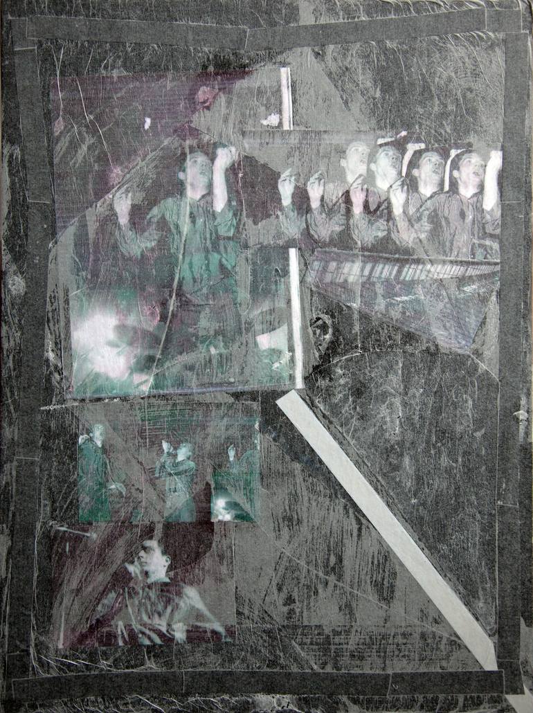 Paper, tissue paper, acrylic, spray paint, electrical tape on canvas panel. Ian Curtis of Joy Division battled with epilepsy before taking his own life in 1980. The remaining members of the band formed New Order.