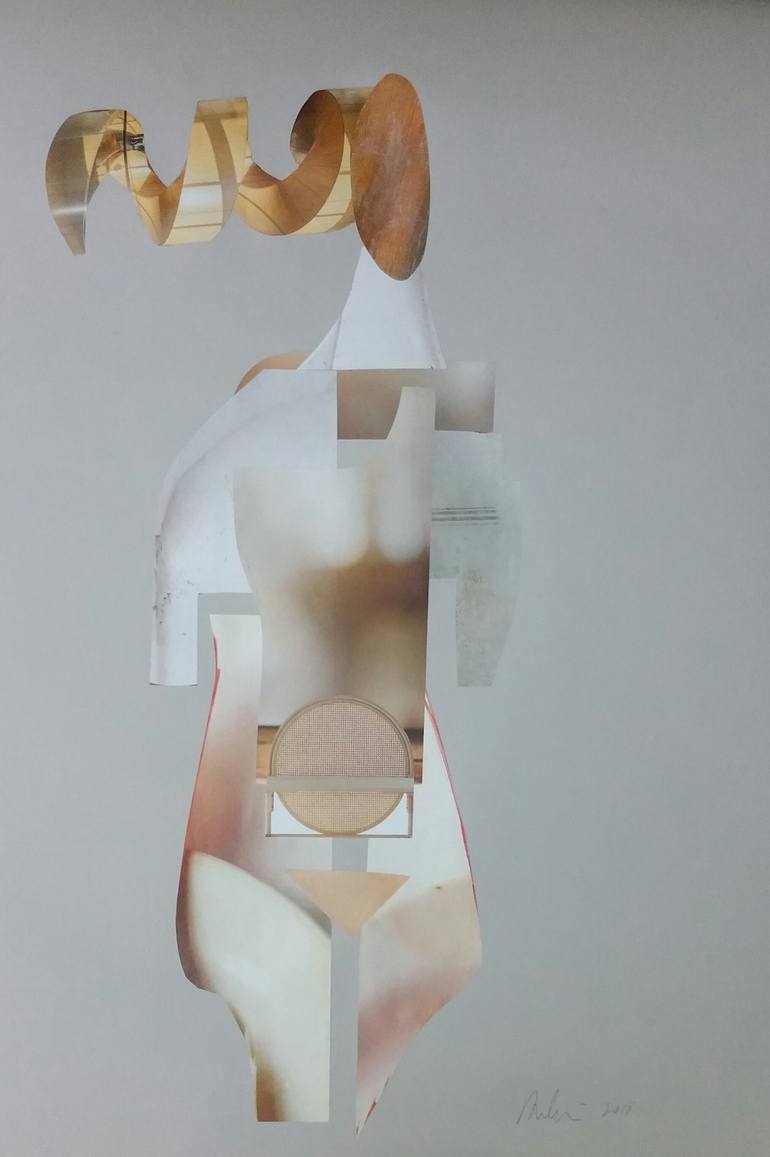 This original collage, "In Full View," embodies feminine strength and joy. The graceful nude figure, with her blond curls, is rendered in delicate paper. The abstract and figurative elements combine to create a modern and fine art piece that celebrates the female form. The artwork hints at themes o...