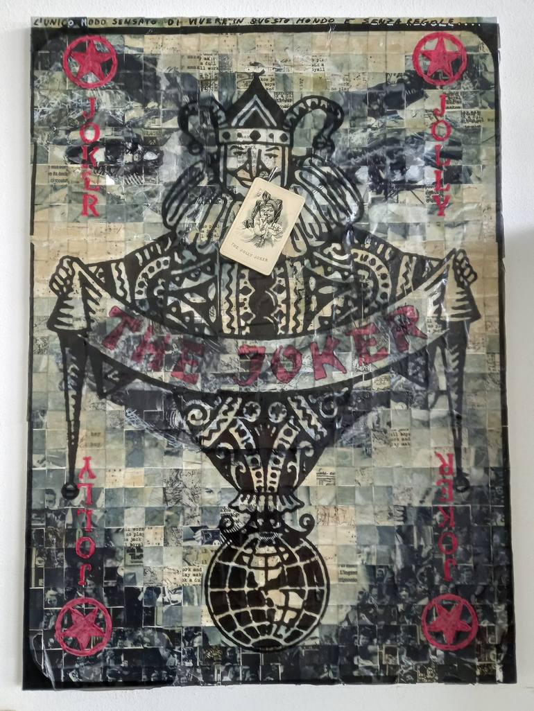 L'UNICO MODO SENSATO DI VIVERE IN QUESTO MONDO E' SENZA REGOLE...875 pezzetti di carta ritagliati dal giornale che formano il viso di Jack Nicholson ricoperti da velina stampata. Poi, tutto ricoperto di resina opaca (rompendo in alcuni punti la figura). Ho aggiunto alla fine una spilla da balia con ...