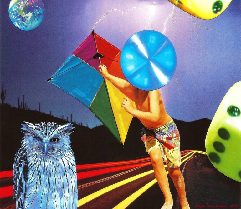 Collage handmade with paper, glue and scissors. Made in Caba, Argentina. Roberto's collages take you into a surreal world. However, his surrealism is based on real world characters in a surreal or incongruous setting, such as football players in the desert with a saintly figure looking down on them...