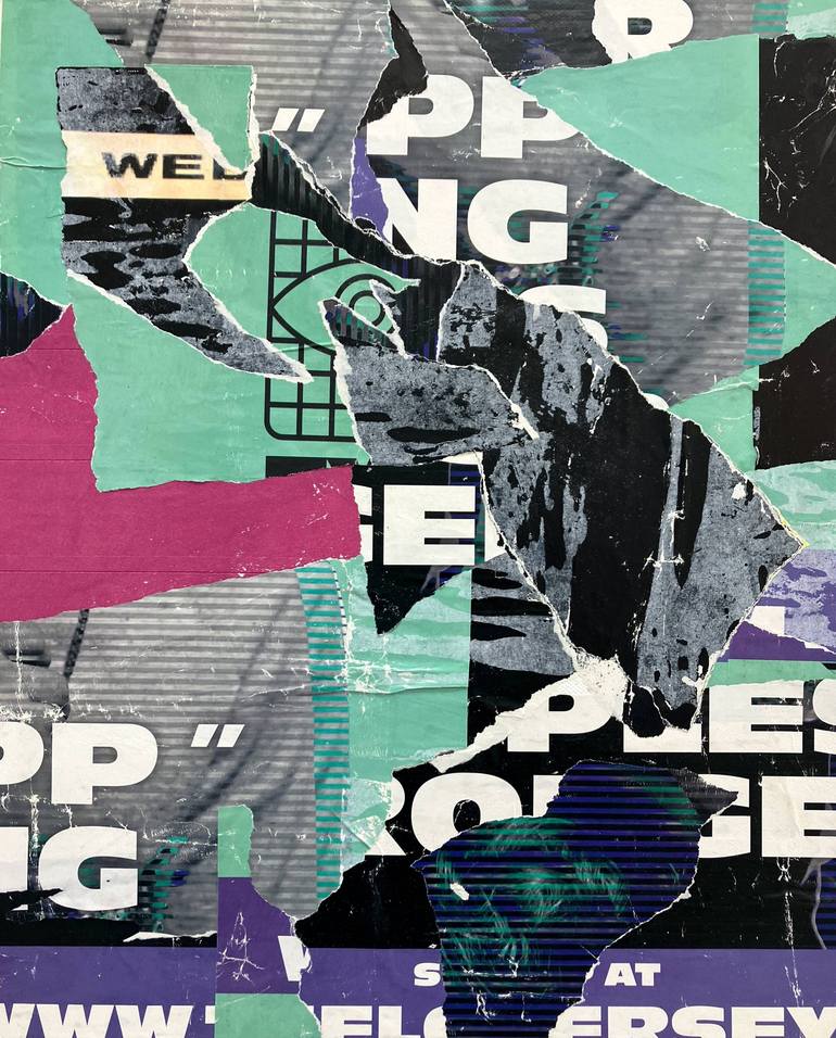 Torn posters on canvas. Part of the LBL series made from distressed posters collected in the streets of London (Brick Lane area). The collected posters are further destroyed to enter into a new composition focusing on spatial rhythm. Ready to hang (framing optional)