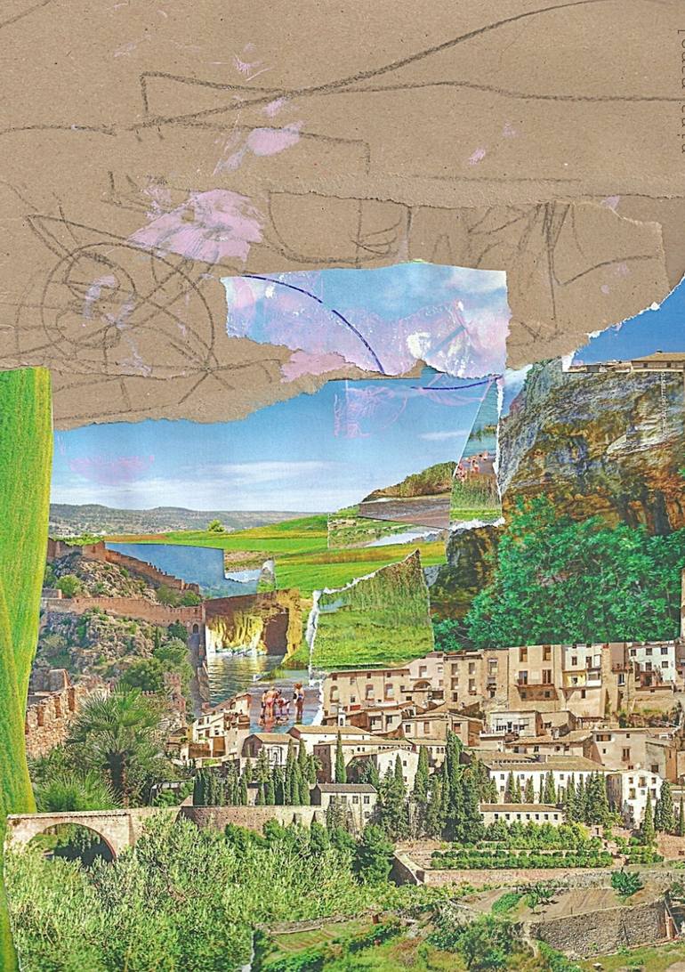Collage on recycled paper, surreal landscape inspired by a village.