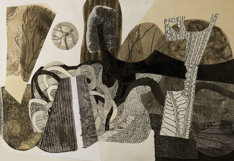 I make drawings of sumi ink and watercolor on paper, then cut them up to assemble collages. The patterns draw from design and architecture I was surrounded by when growing up in Berlin and Istanbul. The composition takes days or weeks to form as I move the pieces until they take their finished posit...