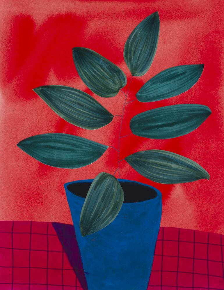 The second in a new series of leaf collage paintings on heavy-duty Arches watercolor paper. Assorted leaves rendered in archival markers that are cut out and collaged over a gouache base. The tightly rendered shaped leaves contrast against the painterly background and objects. Finished with a satin...