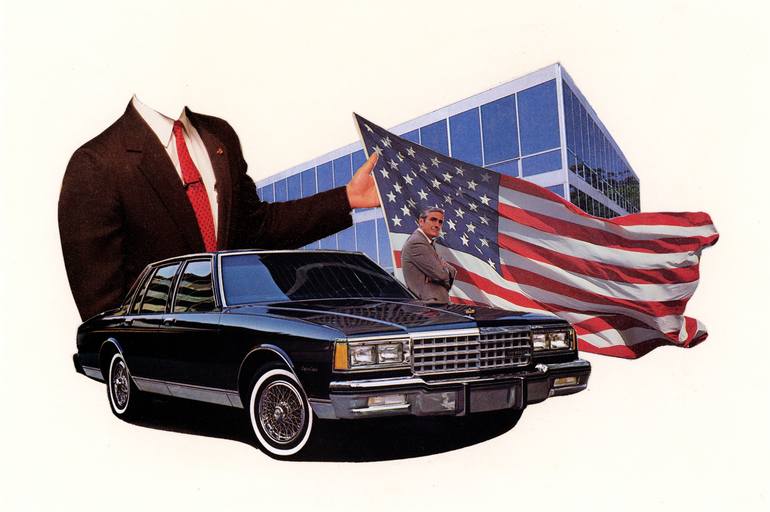 Original collage, analog, hand-cut paper from found materials: old magazines and encyclopedias. US auto industry and the faceless businessmen who sold it.