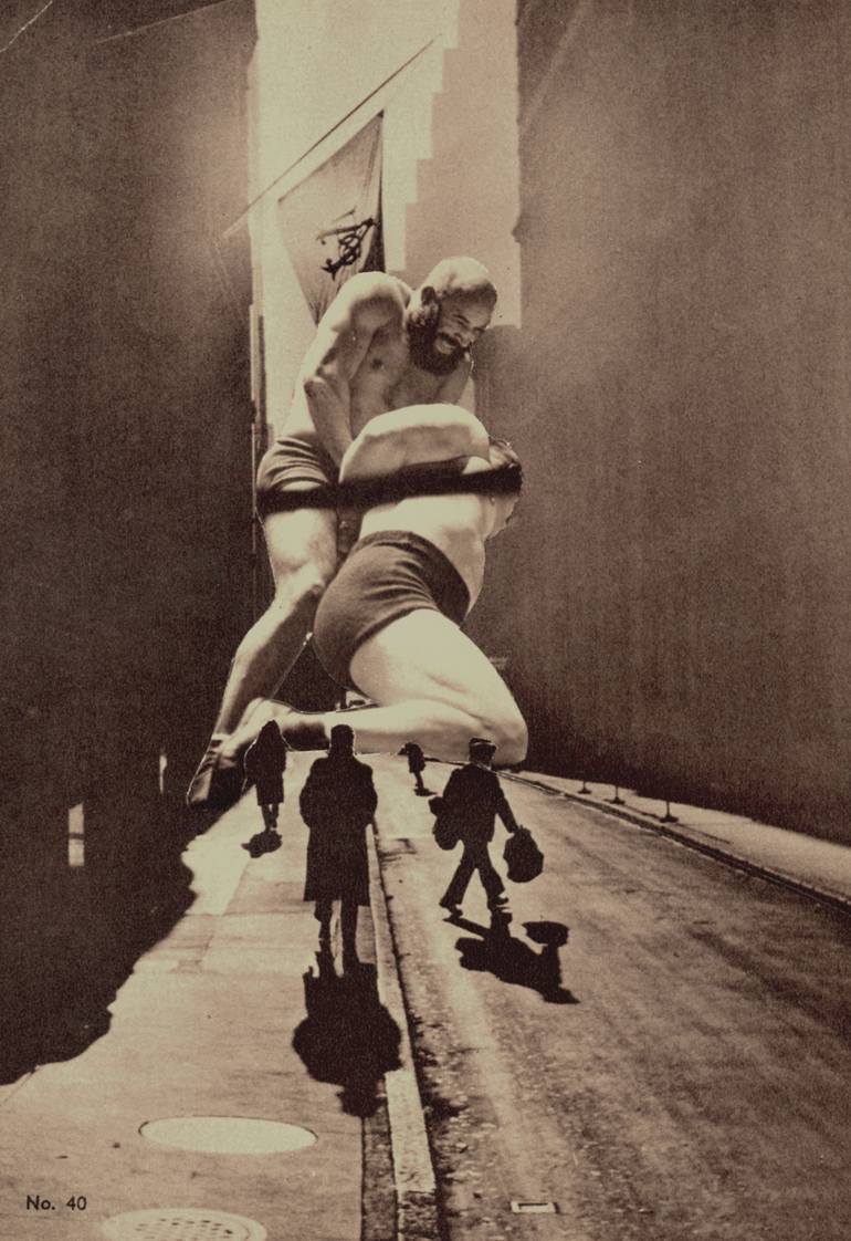 Vintage men fighting in the canyons of a surreal vintage city.