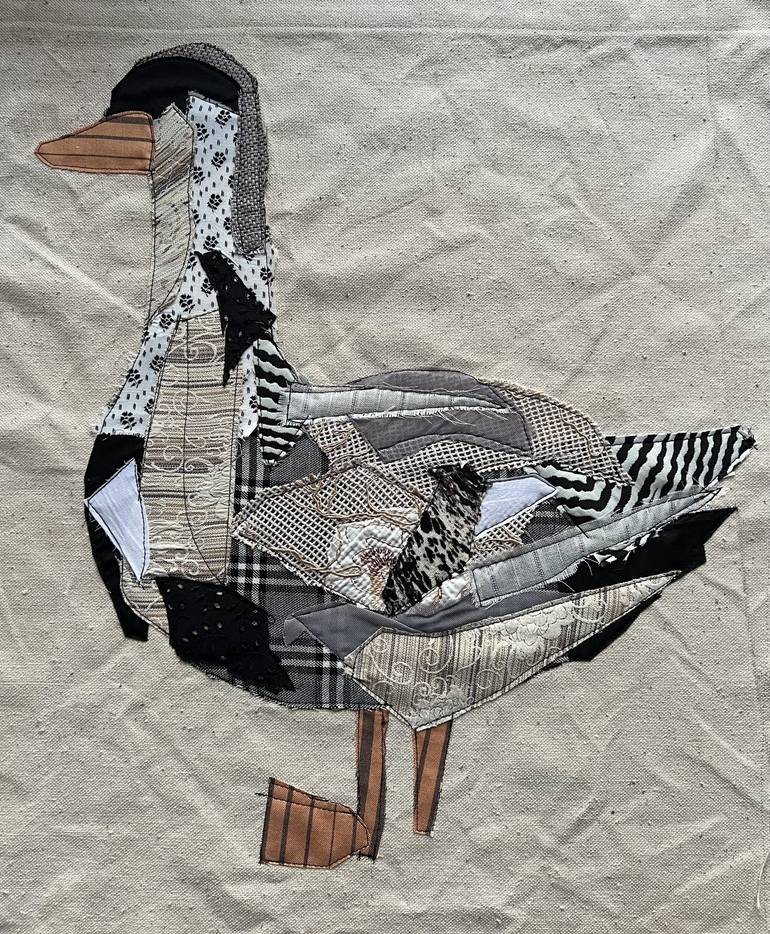 52x50cm This textile panel features a goose, skillfully crafted from a variety of fabric scraps in different textures and shades, seamlessly blending into a cohesive composition. The piece is set on thick, natural-colored canvas with raw, unfinished edges, adding an authentic and organic touch. It h...