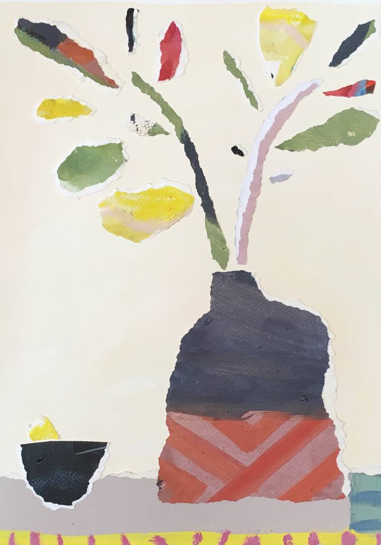 Collage of a vase of flowers with painted watercolor paper.