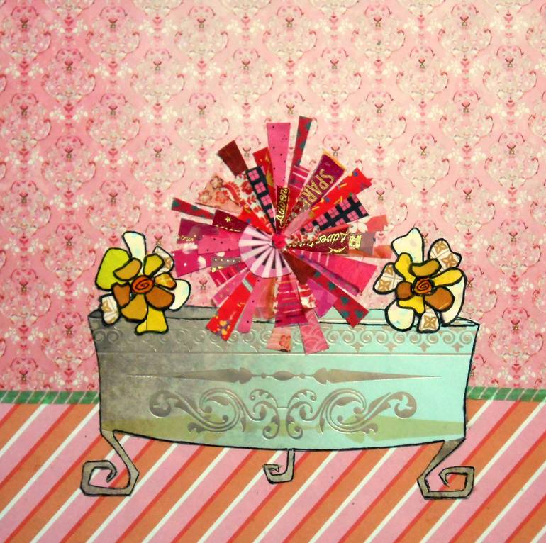 Three very abstract flowers, the center one resembling a large pink chrysanthemum, in an antique tin container with the mellow patina of verdigris, done in a whimsical style.