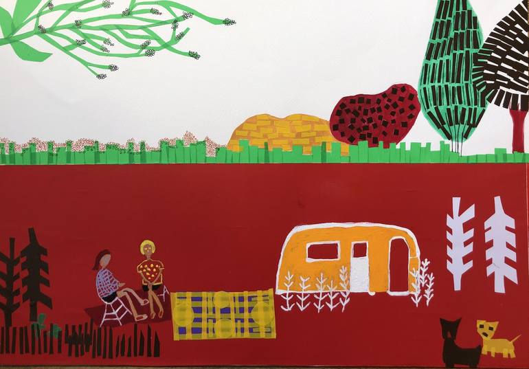 I visited a RV and i inspired me to imagine a spring afternoon in the countryside. I look for the viewers to want to have a picnic and enjoy nature. It is a cooage made with "contact" ( self-adesive paper) and painted with gouache.