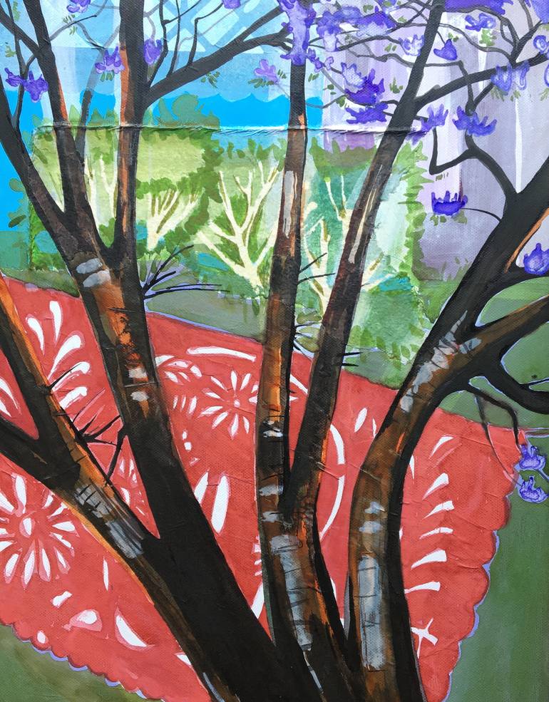 Mexican scene, layers of colour and interest and history. trees and paper banners.