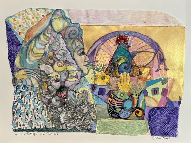 Intuitive drawing and painting with tearing up my art and reimagining it, and using harmonious color combinations to create a gentle poetic mystical feeling.