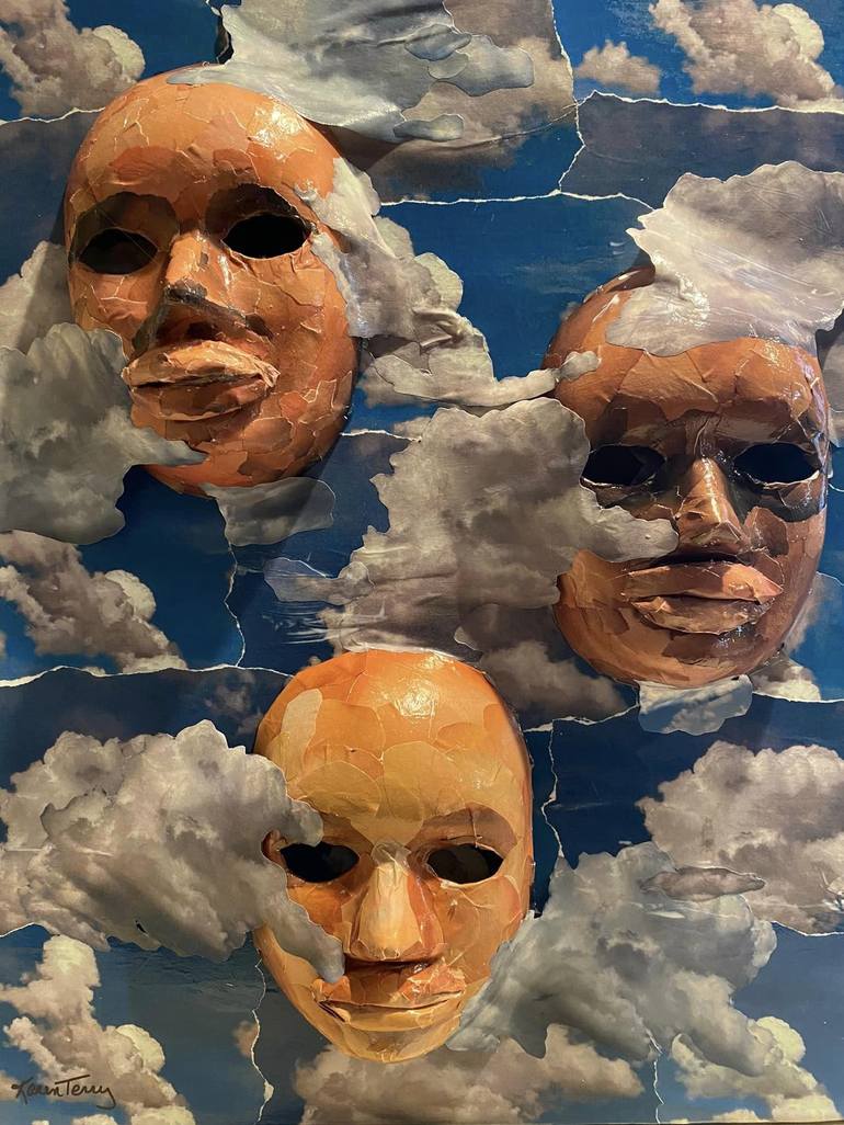 This piece is paper collage on stretch canvas. I used pictures of my daughter, my friend and myself to create the different complexions. The clouds are pictures that I took myself.