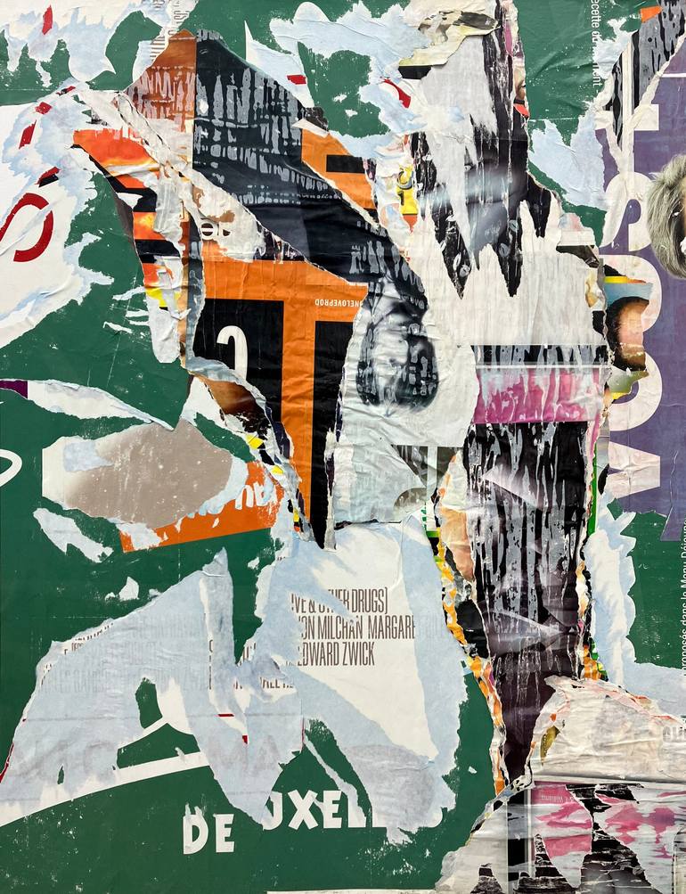 Torn posters on canvas. Part of the 'Sous le Pont' series made from posters collected in Paris (France) under a bridge. A chromatically dominant composition of green and violet, incorporating blacks and oranges in a central part where handmade tears organize a peaceful chaos. Ready to hang (framin...