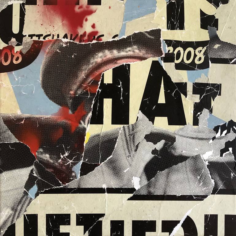 Art work made from music posters used for stencils by Ted Nomad (hence TNM name). I used not only the posters elements but also the delicate cut-outs made for the stencil to recreate an original work that concentrate on rhythm and composition. Red spray paint added.