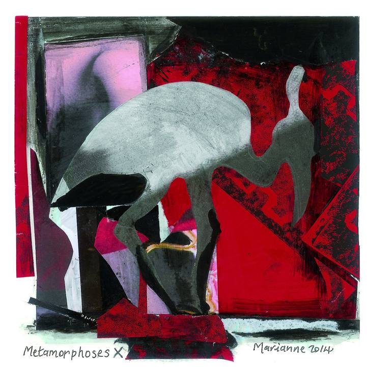 This series of 15 mythical birds explores dimensions and space using collage and painting. I chose a bird as my subject as it is often associated with evolution. The bird in this series is the archetypial wading bird. The birds' long thin legs act as frames revealing dimensions and other worlds...