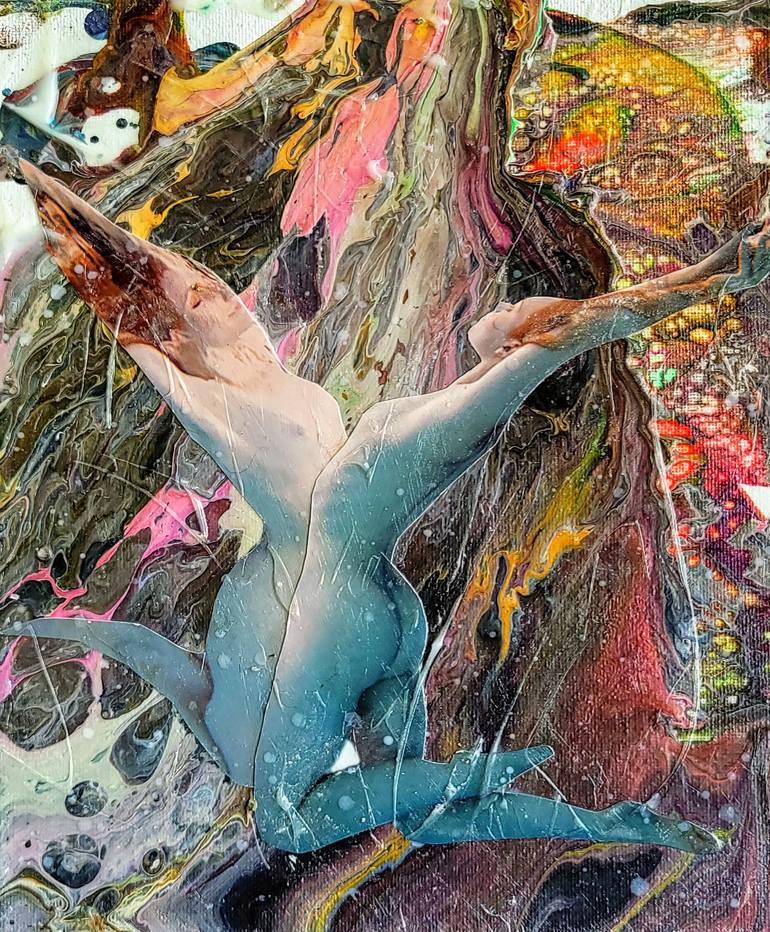 The woman, the image and the ether. As the paint melts into the background, the image imperfectly mirrors the body that stretches into a vortex. The defined curves mix with the confused mergence and inadvertently divulge the lack of distinction between her actual self, and the perceived. "She m...