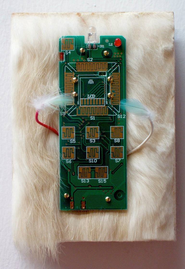 Wood, fur, remote control circuit board, coated wire, parakeet feathers