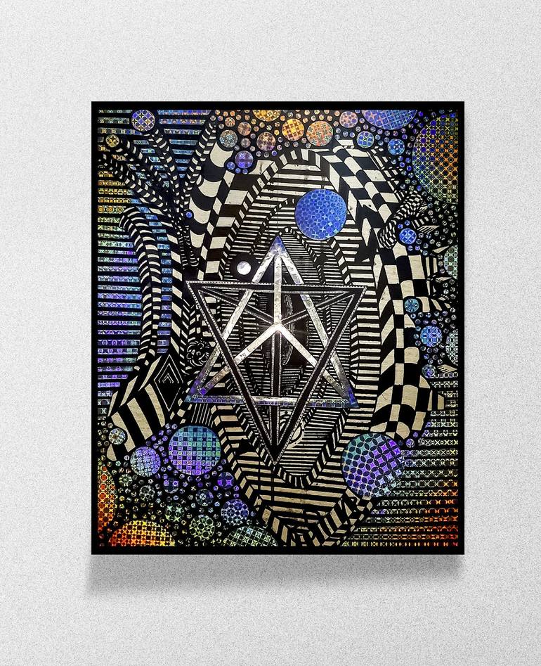 acrilic, marker & holografic/reflective on canvas. Merkabah, also spelled Merkaba, is the divine light vehicle used by ascended masters to connect with and reach those in tune with the higher realms.