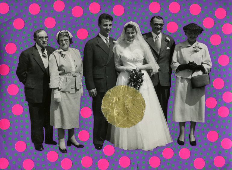 Overview: Although the fresh new couple and the bride's parents are enjoying the moment, the husband's parents seems to be really pissed off. Materials used: Pens, stickers and washi tape on vintage photo. Important notes: • This is an original contemporary art collage realised on a vintage photo...