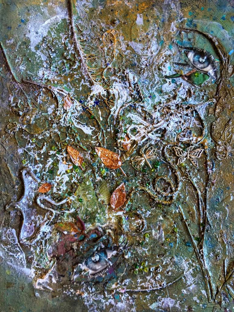 One of a kind mixed media artwork on heavy duty stretched "11x14" canvas. Embellished with a myriad of materials, such as; feathers, string, beads, jewelry, inks, various paints, and paper. This three-dimensional collage portrays an abstract vision of a dark and mysterious forest, hauntingly beaut...