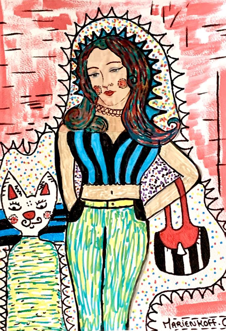 Collage made on thick paper. drawing, collage, acrylic paint, markers. The fashionable cat and woman on vacation, in a colorful street art style.