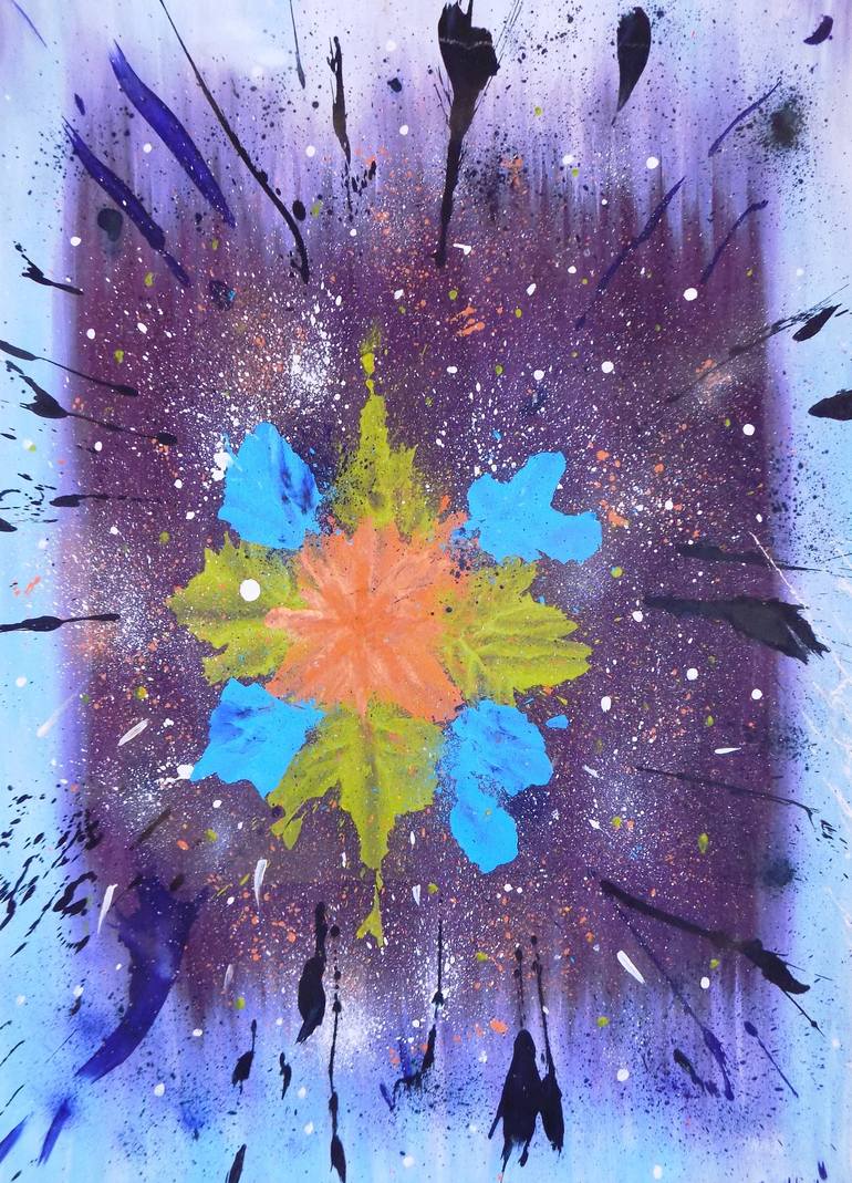 Title Floral splash A floral splash abstract painting using pen cover and collage to bring out the floral design