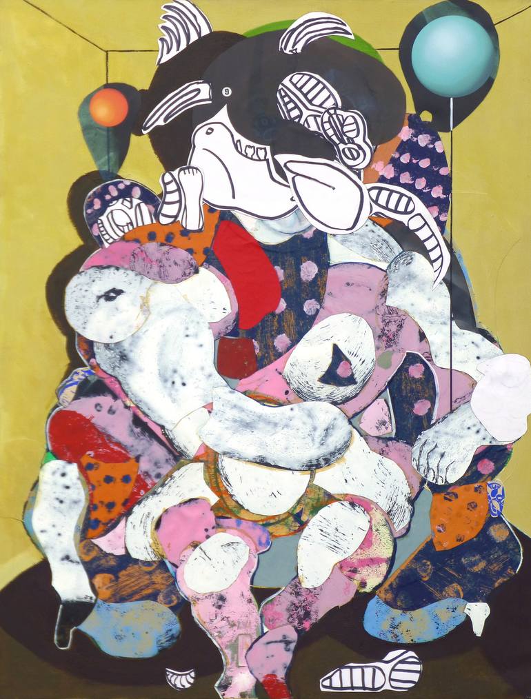 On n'est pas obligé d'être attiré par ces superpositions de rondeurs, il n'en est pas moins vrai qu'elles interpellent ! Ces monstres difformes d'un réalisme saisissant sont posés à l'huile ou à l'acrylique sur toile. Mais ce n'est pas tout, loin de là. L'artiste joue les superpositions, bien visibles quand on se place sur le côté de la toile et que les reflets de lumière accusent les épaisseurs. Utilisant la technique du collage qui se devait, à l'origine, de stimuler l'invention créatrice, Marlin emploie tout ce qui lui tombe sous la main - des bouts de tissus, des fragments de papier calque ou de papier-patron couture - qu'il découpe, compose, mélange, réhausse de couleurs, voire de morceaux de radiographies, fémur, colonne vertébrale, savamment placés à certains endroits pour créer des ombres. Le travail de Marlin, très répétitif, ne manque pas d'attirer la curiosité comme au cirque on s'amuse au spectacle du nain à bosses multiples faisant sur la piste ses pirouettes. On songe aussi aux poupées de celluloïd et de chiffon de notre enfance si souples qu'on pouvait en contorsionner sans risque bras et jambes et même zieuter, un peu sadiquement, les sombres points d'ancrage où se fixaient les membres. Tous ces personnages "impitoyables et graves" constituent un univers peu banal, parfois effrayant nuancé toutefois par une palette chromatique légère et raffinée adoucissant le propos. Pascal Marlin nous semble être un tendre gonflant ses fantasmes pour les mieux apprivoiser ! La lettre mensuelle Les chroniques de Colette Bertot / Février 2005 Pascal Marlin. Bizarre... Vous avez dit "bizarre"? A la Contrast Gallery de Bruxelles