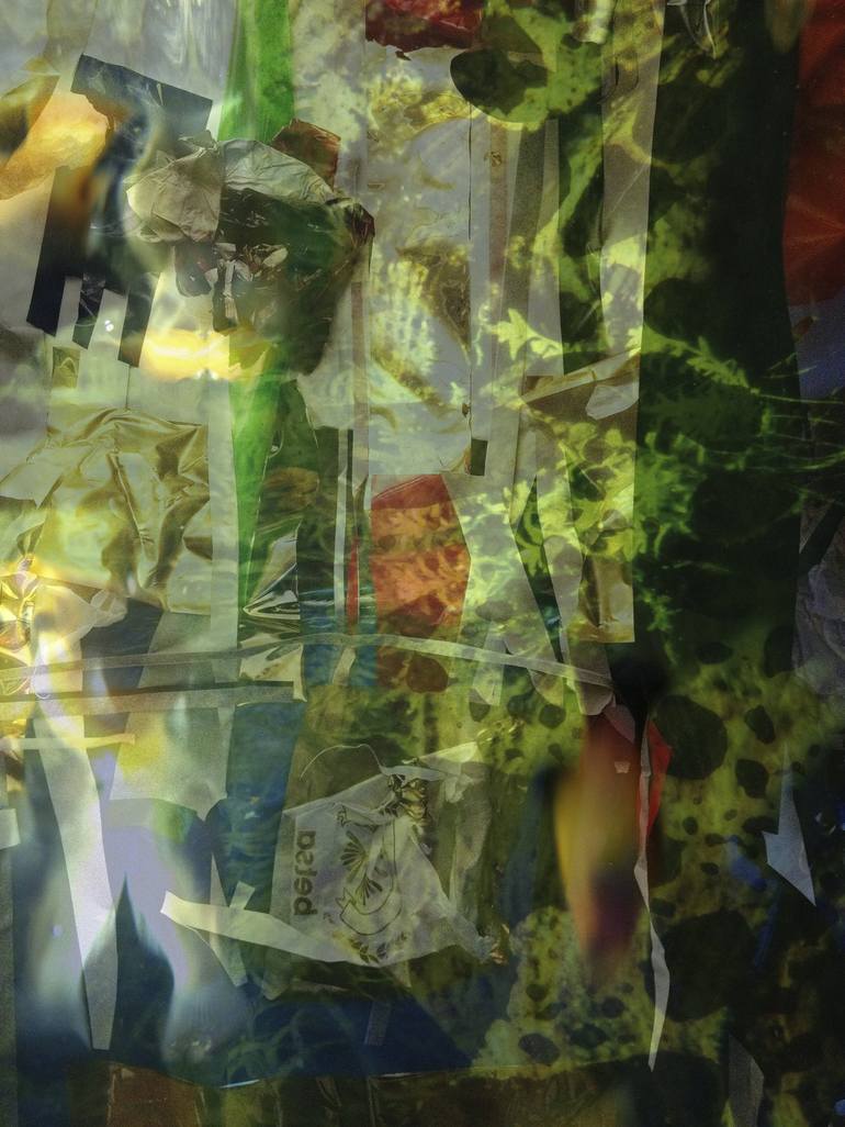 collage installation-performance in my living room in house we are tearing down...turning into an aquarium-like environment with found and discarded materials from my workplace becoming collage covering all white wall space and even hanging off the ceiling. Partial areas are painting/drawings either...