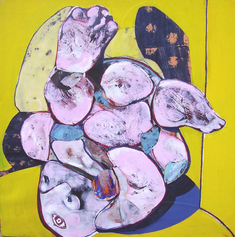 On n'est pas obligé d'être attiré par ces superpositions de rondeurs, il n'en est pas moins vrai qu'elles interpellent ! Ces monstres difformes d'un réalisme saisissant sont posés à l'huile ou à l'acrylique sur toile. Mais ce n'est pas tout, loin de là. L'artiste joue les superpositions, bien visibles quand on se place sur le côté de la toile et que les reflets de lumière accusent les épaisseurs. Utilisant la technique du collage qui se devait, à l'origine, de stimuler l'invention créatrice, Marlin emploie tout ce qui lui tombe sous la main - des bouts de tissus, des fragments de papier calque ou de papier-patron couture - qu'il découpe, compose, mélange, réhausse de couleurs, voire de morceaux de radiographies, fémur, colonne vertébrale, savamment placés à certains endroits pour créer des ombres. Le travail de Marlin, très répétitif, ne manque pas d'attirer la curiosité comme au cirque on s'amuse au spectacle du nain à bosses multiples faisant sur la piste ses pirouettes. On songe aussi aux poupées de celluloïd et de chiffon de notre enfance si souples qu'on pouvait en contorsionner sans risque bras et jambes et même zieuter, un peu sadiquement, les sombres points d'ancrage où se fixaient les membres. Tous ces personnages "impitoyables et graves" constituent un univers peu banal, parfois effrayant nuancé toutefois par une palette chromatique légère et raffinée adoucissant le propos. Pascal Marlin nous semble être un tendre gonflant ses fantasmes pour les mieux apprivoiser ! La lettre mensuelle Les chroniques de Colette Bertot / Février 2005 Pascal Marlin. Bizarre... Vous avez dit "bizarre"? A la Contrast Gallery de Bruxelles