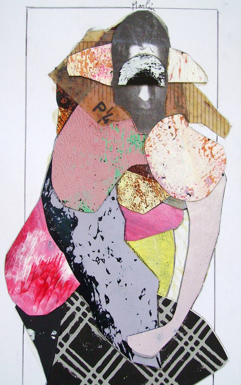 On n'est pas obligé d'être attiré par ces superpositions de rondeurs, il n'en est pas moins vrai qu'elles interpellent ! Ces monstres difformes d'un réalisme saisissant sont posés à l'huile ou à l'acrylique sur toile. Mais ce n'est pas tout, loin de là. L'artiste joue les superpositions, bien visibles quand on se place sur le côté de la toile et que les reflets de lumière accusent les épaisseurs. Utilisant la technique du collage qui se devait, à l'origine, de stimuler l'invention créatrice, Marlin emploie tout ce qui lui tombe sous la main - des bouts de tissus, des fragments de papier calque ou de papier-patron couture - qu'il découpe, compose, mélange, réhausse de couleurs, voire de morceaux de radiographies, fémur, colonne vertébrale, savamment placés à certains endroits pour créer des ombres. Le travail de Marlin, très répétitif, ne manque pas d'attirer la curiosité comme au cirque on s'amuse au spectacle du nain à bosses multiples faisant sur la piste ses pirouettes. On songe aussi aux poupées de celluloïd et de chiffon de notre enfance si souples qu'on pouvait en contorsionner sans risque bras et jambes et même zieuter, un peu sadiquement, les sombres points d'ancrage où se fixaient les membres. Tous ces personnages "impitoyables et graves" constituent un univers peu banal, parfois effrayant nuancé toutefois par une palette chromatique légère et raffinée adoucissant le propos. Pascal Marlin nous semble être un tendre gonflant ses fantasmes pour les mieux apprivoiser ! La lettre mensuelle Les chroniques de Colette Bertot / Février 2005 Pascal Marlin. Bizarre... Vous avez dit "bizarre"? A la Contrast Gallery de Bruxelles
