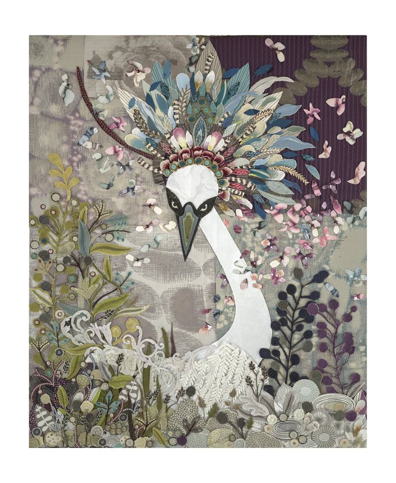 Anna was brought up in rural Wales until her early 20's, then moved to London to do her foundation year. After moving to Brighton to do her degree, she embraced the seaside city as her new home and set up studio on the seafront. Here she developed her technique and love for collage. Using old fabric and wallpaper books, she created a language which filled her desire for colour, texture, shape, and form. Using the patterns on fabric and paper she built her own narrative celebrating the diversity of these materials. The main subjects are nature and the human face, "Using fabric and paper instead of paint brings me a whole new spectrum of diversity. I love the way the light catches different materials (especially silk and velvet) giving a tactile feeling and an unusual depth to my pieces."