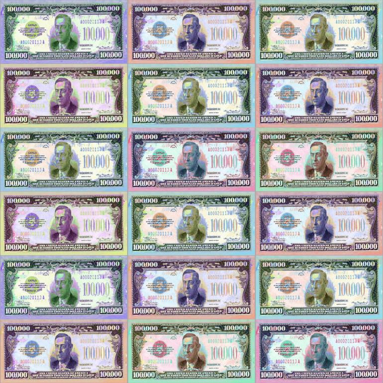 This piece, created using the U.S. $100,000 bill: Woodrow Wilson, 28th U.S. President (1913 to 21) - the largest denomination ever printed in the United States.
