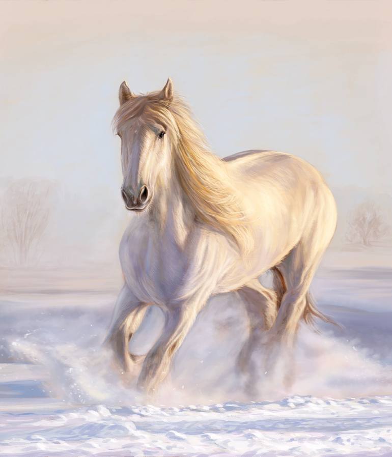 A white horse races towards me across the snowy field on a sunny winter day, its mane trembling in the breeze.