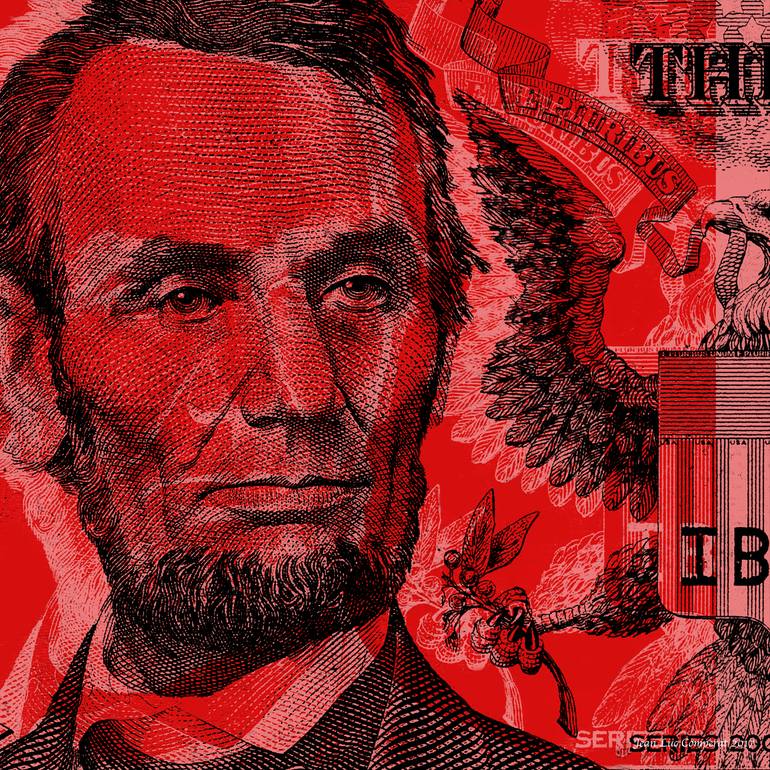 Abraham Lincoln Pop Art Warhol style - Detail $5 bill - red background. Original: giclee on canvas hand signed, numbered and dated - 36" x 36" with 2" extra border - rolled / shipped in tube. Prints - photo paper, fine art paper or canvas signed and dated. The United States five-dollar bill ($5)...