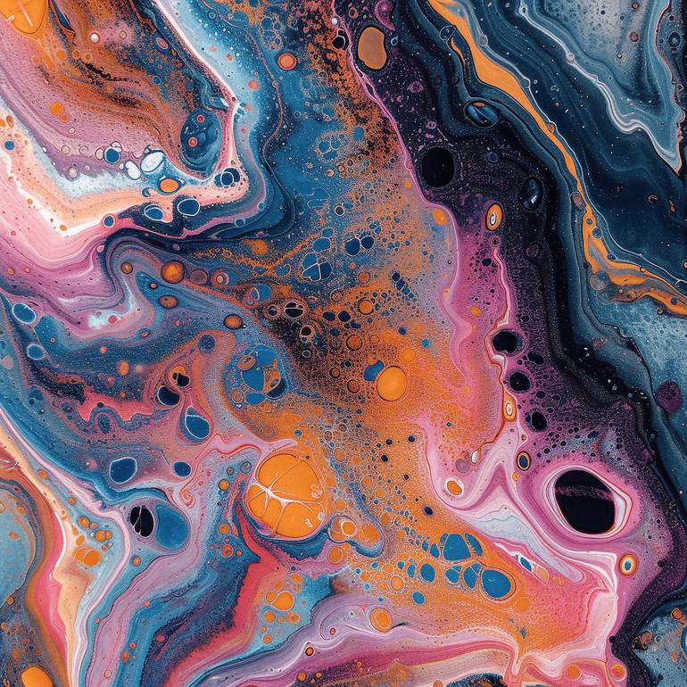 This fluid art piece is a symphony of color, where swirls of deep navy and indigo blend with vibrant coral and delicate pink hues. The mesmerizing patterns are highlighted with pops of bright orange and dotted with tiny cells, resembling a cosmic view of interstellar nebulae or the intricate details...