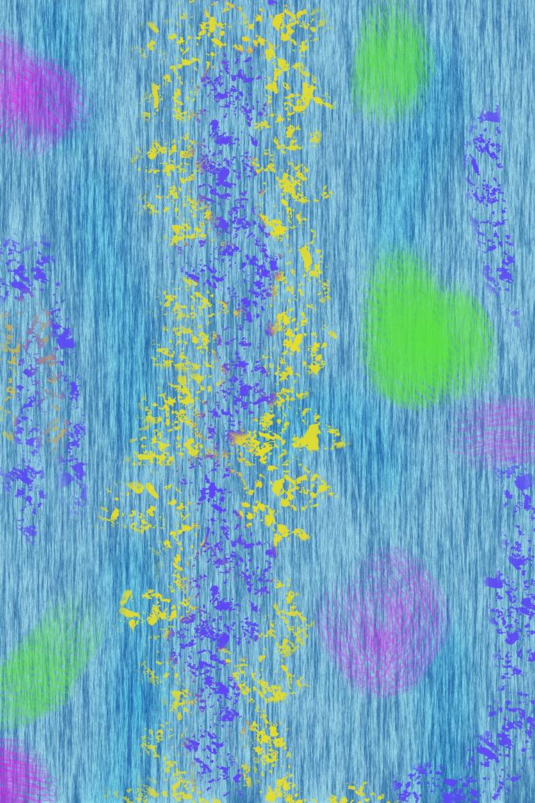The artwork features a textured blue background with vertical streaks and patches of vibrant colors. Yellow and purple splatters form a central vertical band, adding a sense of movement. Green and pink irregular shapes are scattered across the canvas, creating a dynamic contrast. The combination of ...