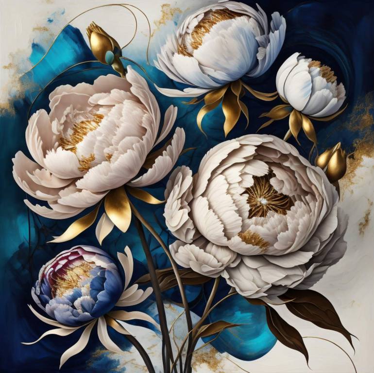 Abstract Blue Golden peonies Find the perfect piece for your living space today. Made with museum-grade paper (175gsm fine art paper).Matte finish.