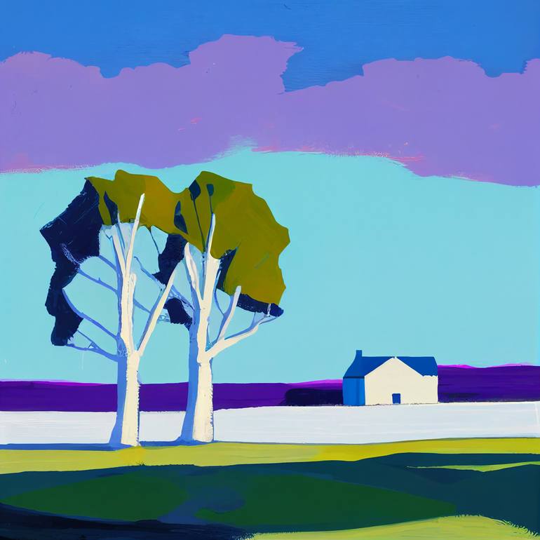 The first in a series of imagined farm scenes in southwestern Ontario. An abstracted farmhouse set against a bold sky, with two birch trees in the foreground. The work uses bold, abstracted, simplified/minimalist shapes and forms, with a flat but bright colour palette to achieve depth and perspectiv...