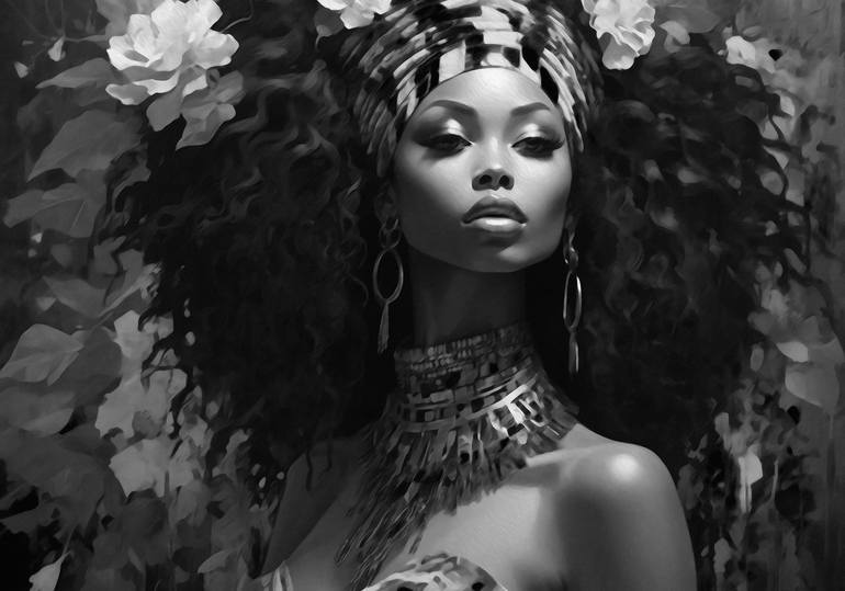 "African Goddess in Blossom" in black and white, a photographic marvel crafted by artificial intelligence, transcends the boundaries of conventional imagery. This work captures the timeless essence of an African goddess, weaving together elements of heritage, strength, and grace. In this monochroma...