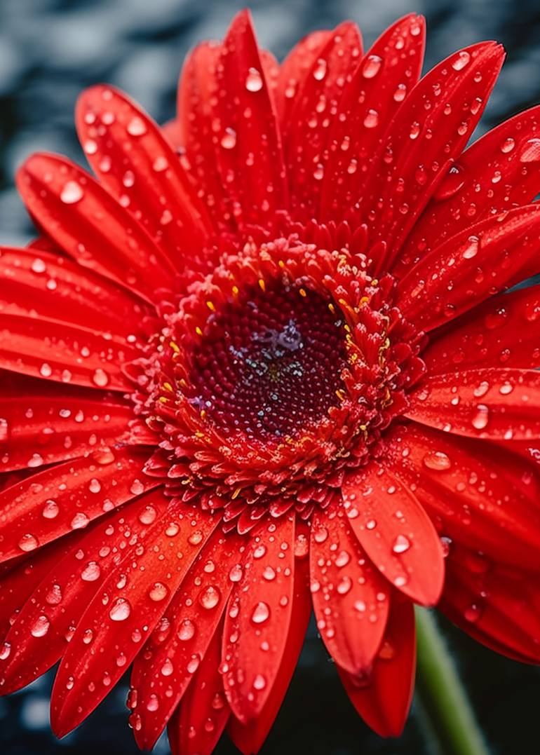This stunning close-up, photorealistic painting captures the vibrant beauty of a red gerbera daisy in exquisite detail. Dewdrops cling delicately to its petals, creating a mesmerizing interplay of light and texture. The rich, saturated color of the flower pops against a dark, moody background, drawi...