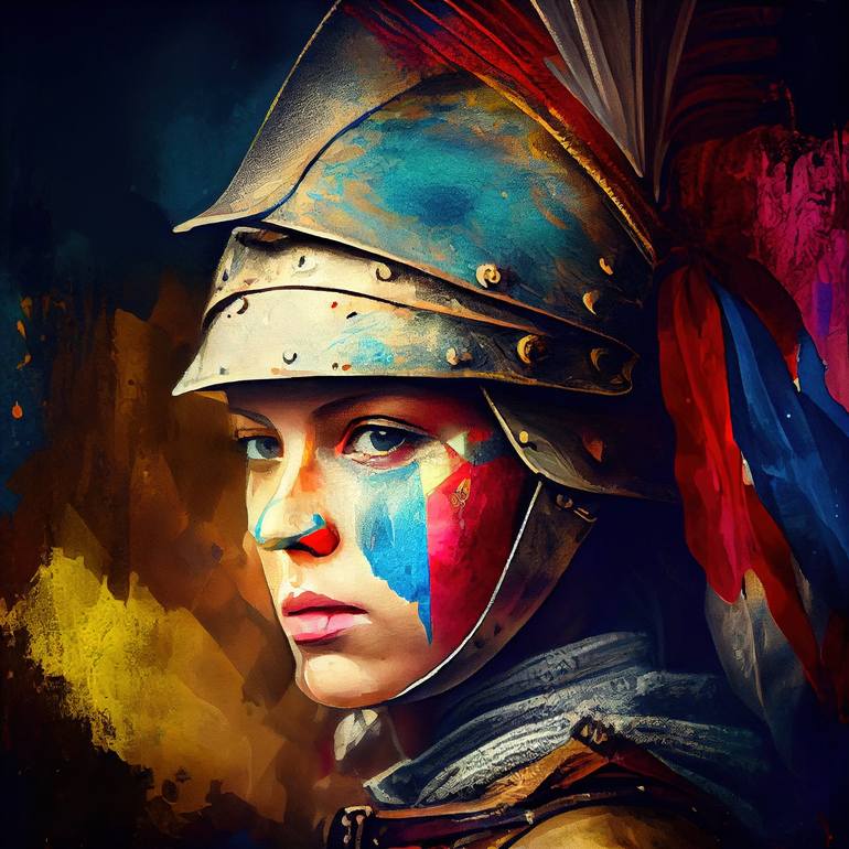 A bold close up portrait of a warrior woman wearing an ornate helmet washed in turquoise and cobalt tones. Vivid red and blue accents fall across the cheek like ceremonial markings, while deep shadows sculpt the face and armor for strong contrast and clarity. The dark background and clean negative s...
