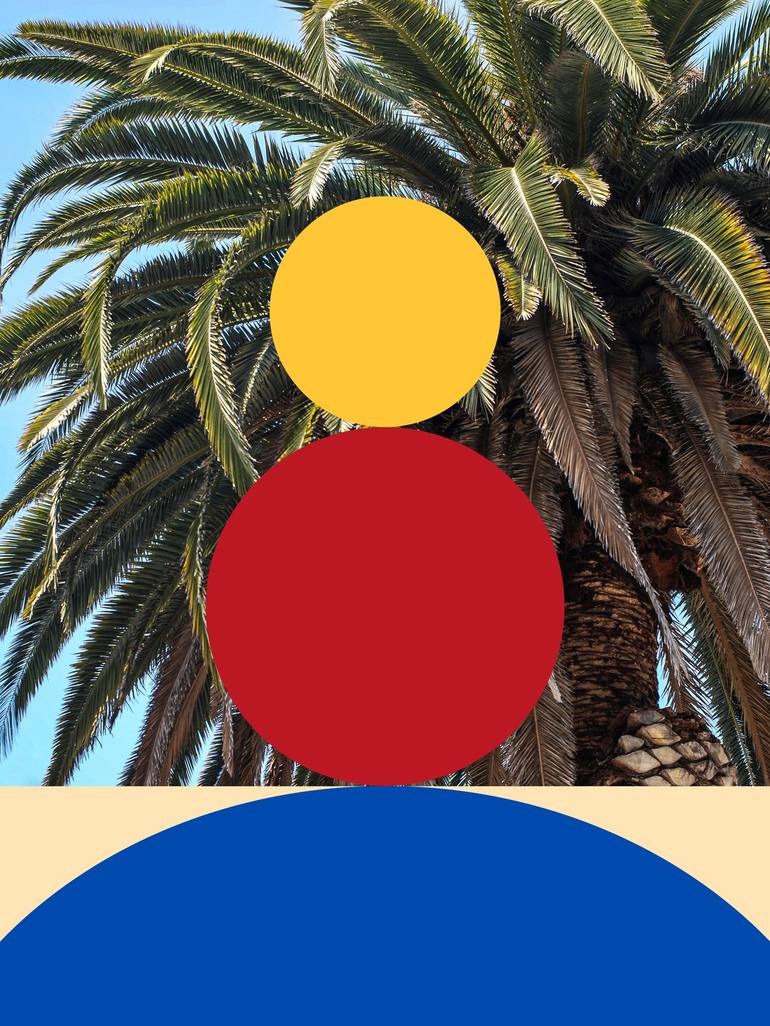 Step into a world where vibrant hues meet the lush elegance of Bel-Air. This captivating artwork, aptly titled “Bel-Air,” masterfully combines geometric simplicity with natural grandeur. The vivid circles of red, yellow, and blue juxtaposed against the lush backdrop of towering palm trees create a v...