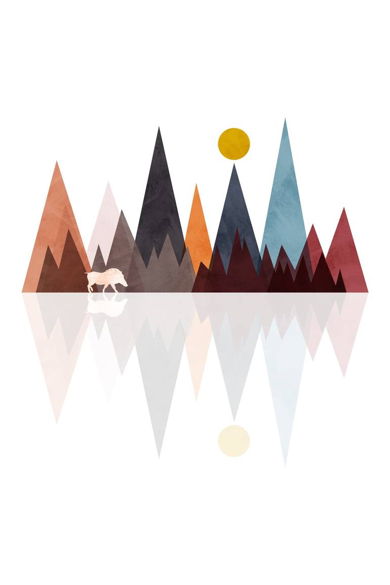 Minimal illustration of a boar walking in front of the mountains.