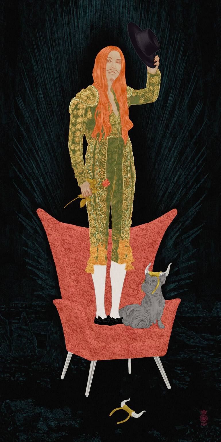 This is an image of a young woman, dressed as a toreador. She is standing on an orange chair. Next to her on the chair all her two dogs. They both have been dressed up as little bulls. The prints are made on high quality fine art paper. The print is invisibly bonded behind a panel of museum grade a...