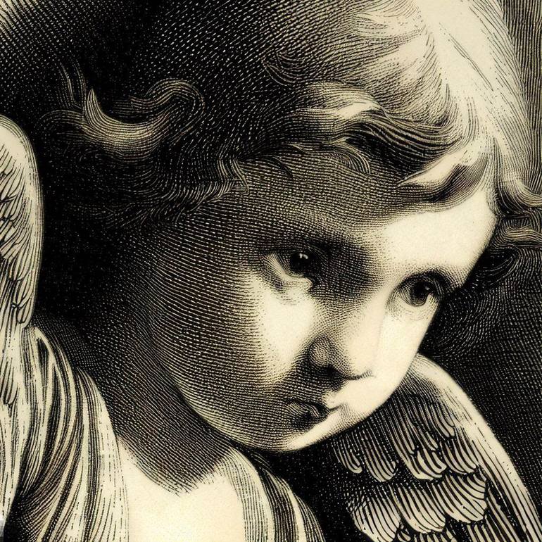 A thematic AI generated image in lithogravure style, revisiting the angels theme with a gorgeous and cute approach into cherubim portraits. Part 2 of a new series of 10 under this theme.