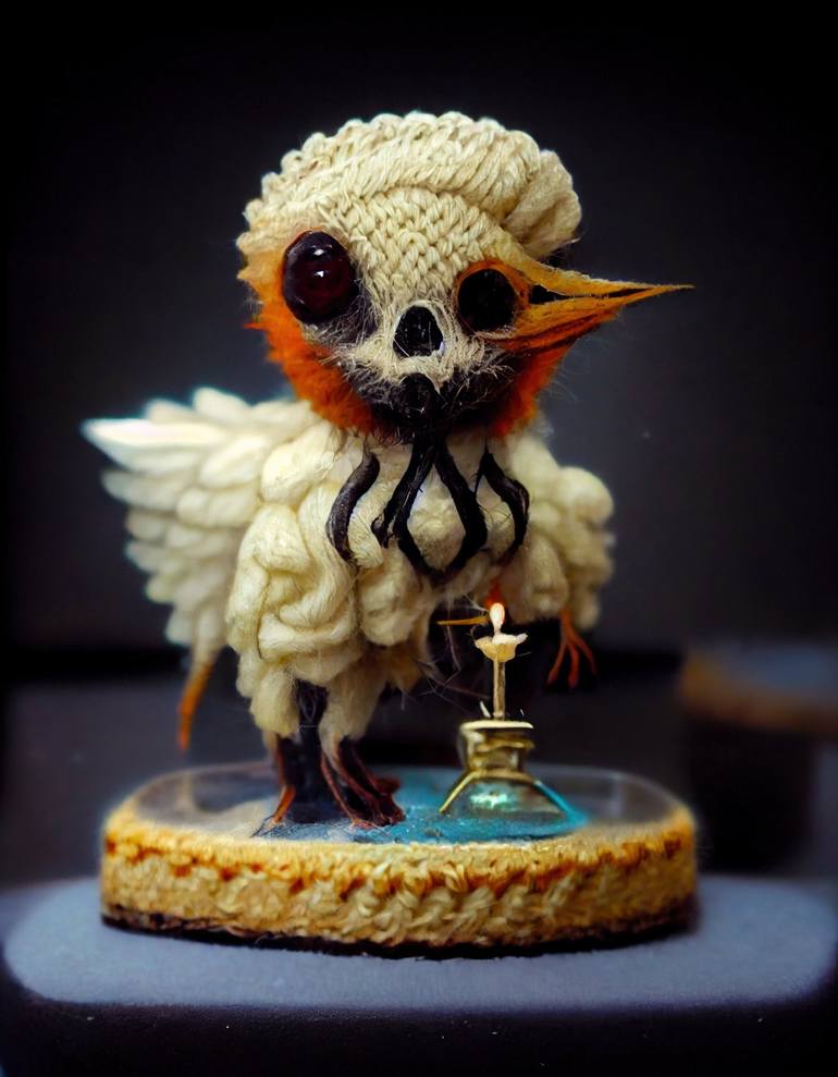 A tiny cute demon character made out of knitting. Image made with Artificial Intelligence.