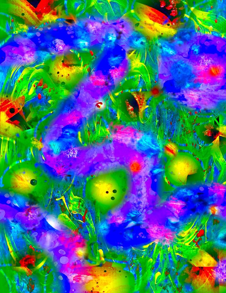 Digital Art World 111 is inspired by the advent of Spring. Vibrant colors depict nature's blossoming of flowers, buds in trees, birds flying, butterflies fluttering etc.