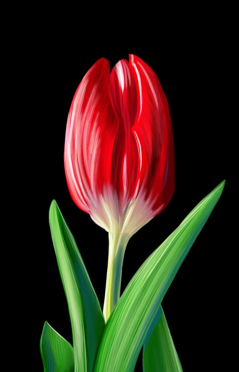 Digital drawing of a large red tulip on a black background.