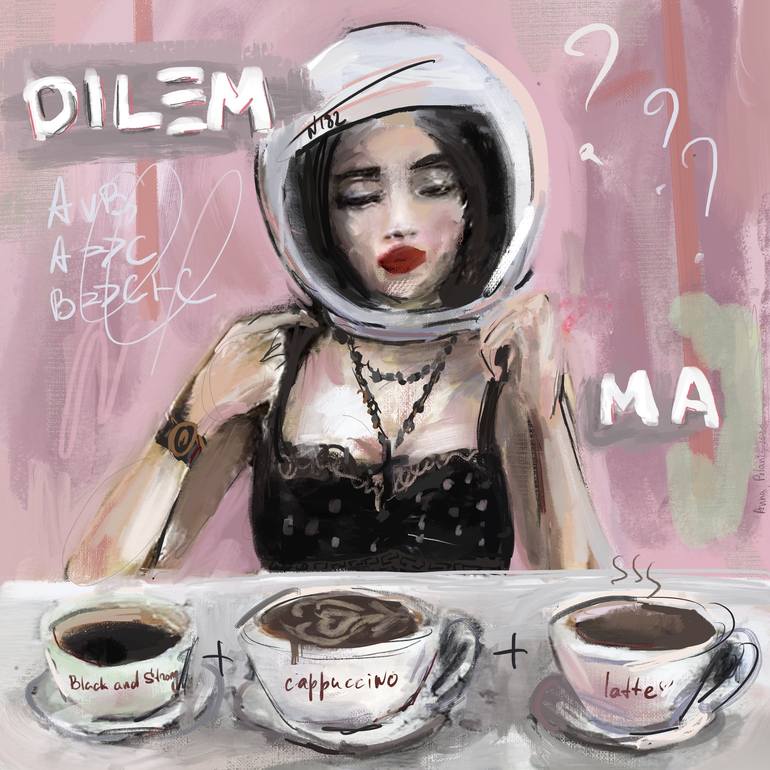 The woman, much like ourselves, faces a dilemma: which type of coffee to select? The three cups symbolize our myriad options, yet the inscription "dilemma" serves as a reminder that our own predicaments are minuscule when compared to the vastness of the cosmos. We are part of an enormous and incredi...